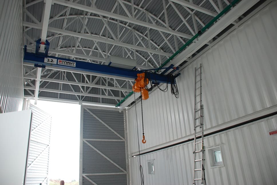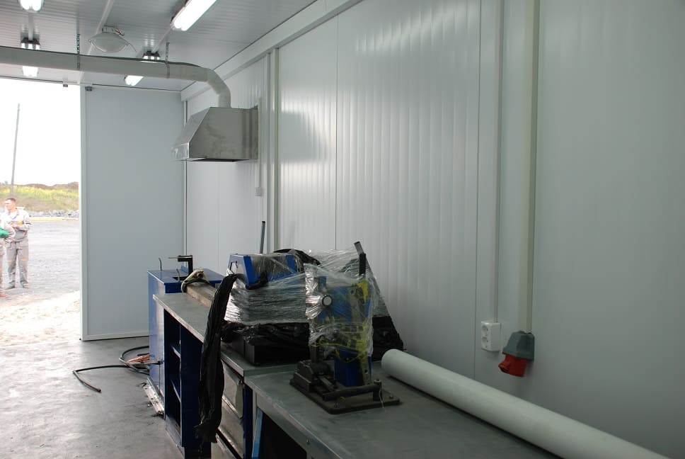 Сервисно-полевая станция — очередной проект, ставший уже серийным, произведен нашим предприятием в кратчайшие сроки (1 месяц) и смонтирован в Новосибирской области на угольном разрезе. В данной станции учтен опыт эксплуатации предыдущих изделий и внесены некоторые корректировки. Например, мы отказались полностью от тентовых конструкций, и заменили их на каркасные ограждающие конструкции цеха, кровлю перекрыли профлистом, оснастили СПС воротами. Как и в ранних версиях, СПС оборудована кран-балкой.
